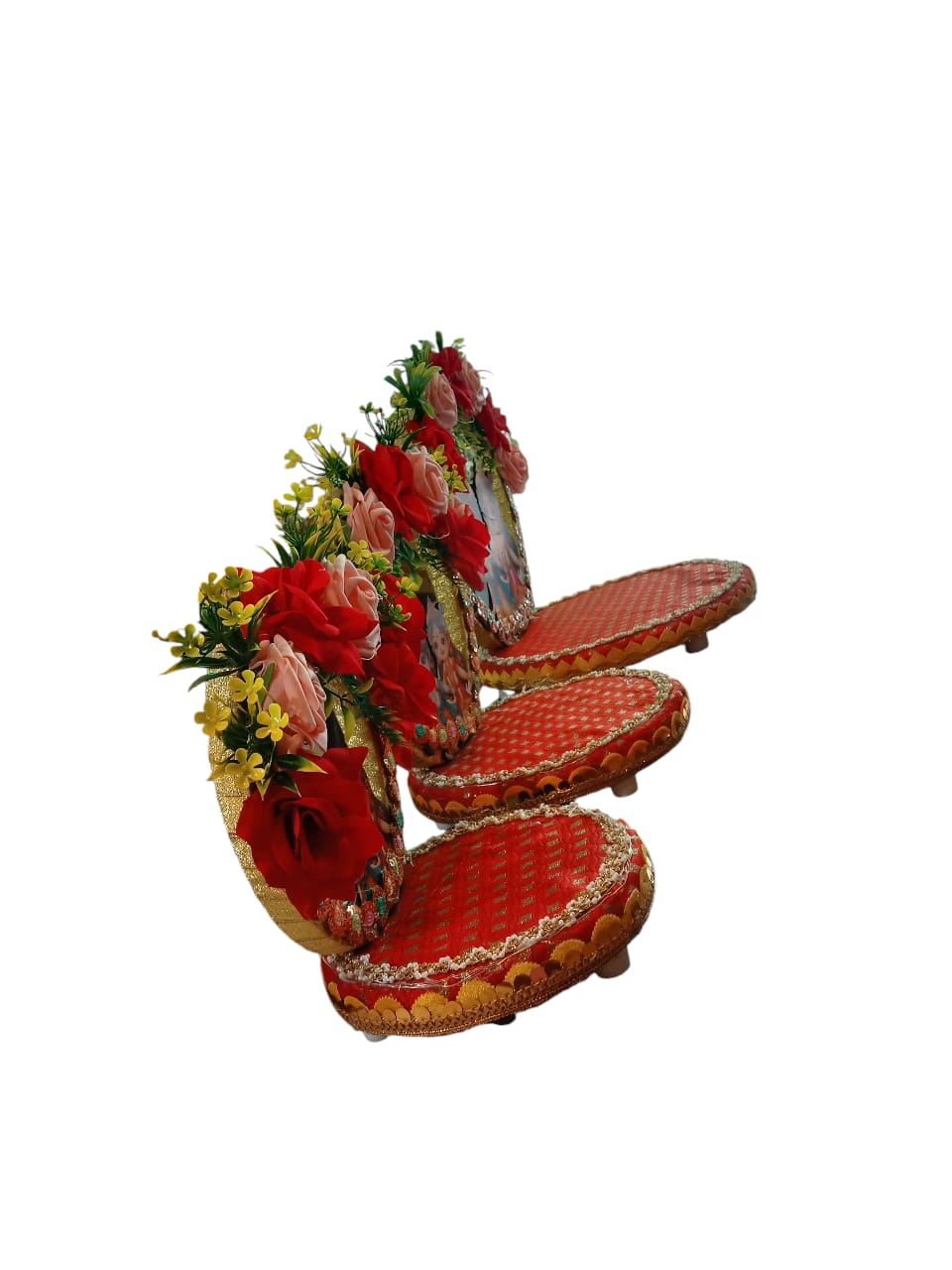 Floral‑themed seat: The base often mirrors a lotus or floral platform, covered in soft fabrics like velvet or cushion material, and edged with floral prints or artificial flowers in complementary colors .