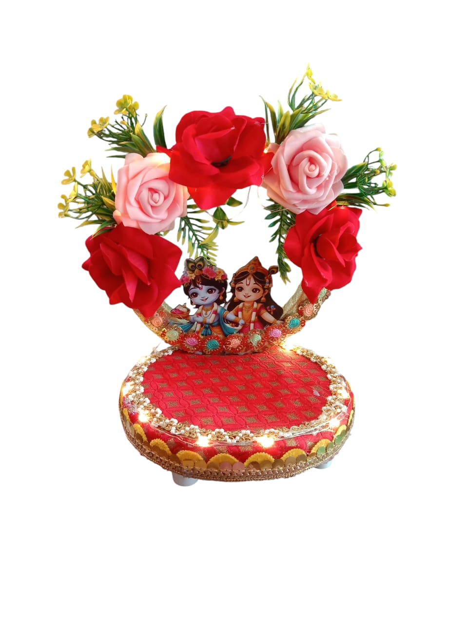 Soft LED lights: Miniature LEDs are woven through the flower arch and seat, casting a warm, heavenly glow. This lighting highlights the idol and is especially enchanting during early morning or evening prayers .
