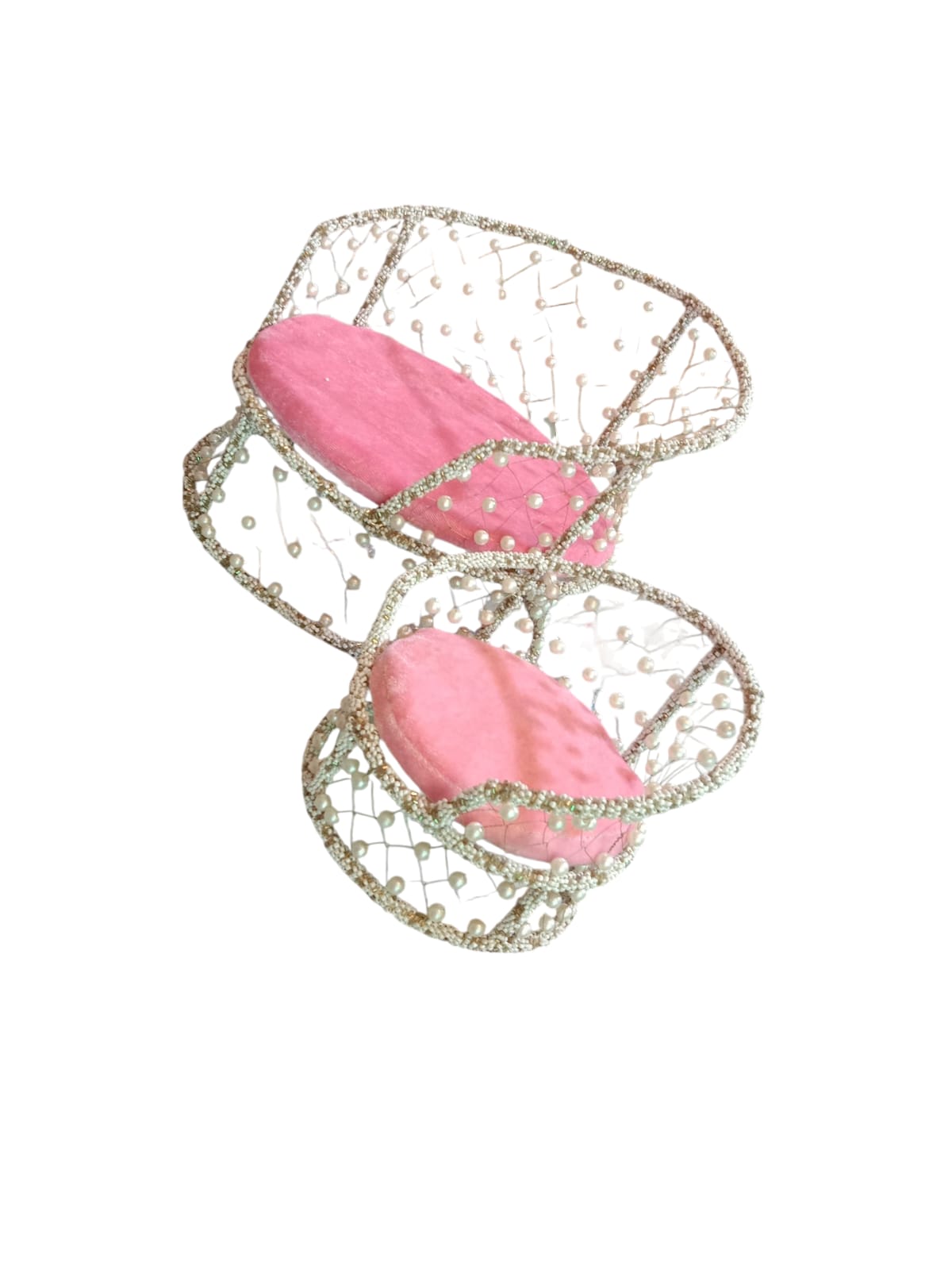 Beaded decoration: Rows of faux pearls (motis) adorn the edges, backrest, or front border, creating a luminous and graceful outline around the idol